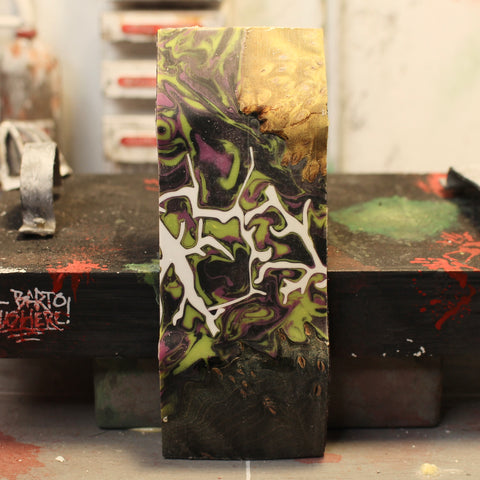 Doom Lagoon fingerboard decks are the result of nearly a decade of deck making experience by Noah Schlosser. Avant-garde shapes, materials, and production methods have been thoroughly tested to ensure one of the most realistic feeling fingerboard decks. Rather than the board being scaled to the size of an actual skateboard, it is scaled to the length of our legs relative to our fingers. This progressive design allows you to position your fingers the same way you would on an actual skateboard. All Doom Lagoon fingerboard decks have medium concave and medium/high kicks designed with performance in mind. The nose is slightly higher than the tail, just like a real skateboard, to allow your front finger to slide up the board and catch the nose for ollies and other flip tricks. Each deck is made of carefully curated hardwoods in unique lay-ups to ensure the most pop and structural integrity. Plies are dyed for at least 3 weeks to ensure all dye has penetrated through the veneer all the way for a vibrant look. Holes are machine drilled with extreme precision to allow trucks to perfectly fit each and every time in the exact spot for peak performance. All Doom Lagoon fingerboard decks are lacquered with three coats on each face, sealing the wood. This adds pop and durability, as well as a glossy shine.